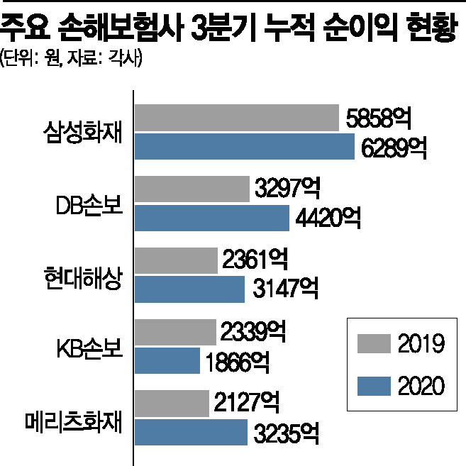 17일 보험업계에 따르면 국내 손해보험사 상위 5개사의 3분기 누적 순이익은 1조8984억원을 기록, 지난해 같은 기간 1조5982억원 대비 18.7% 가량 증가했다.