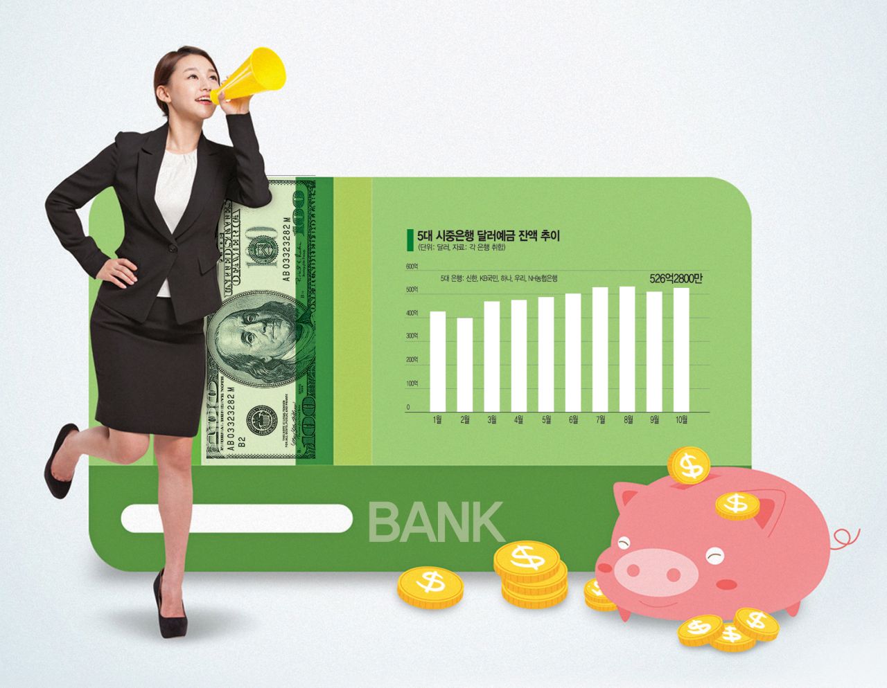 쌀 때 달러를 사두려는 '환테크' 열풍이 불면서 은행권 달러예금 잔액이 쌓여가고 있지만 달러 지폐를 인출할 경우 1%대의 수수료가 청구되는데다 원화로 환전할 경우 향후 달러 약세에 따른 환차손까지 발생할 수 있어 주의가 필요하다.5대 은행 달러예금 잔액 526억달러18일 금융업계에 따르면 5대 시중은행의 10월 말 기준 달러예금 잔액은 526억2800만달러로 역대 최대 수준이다. 올해 1월 말 426억8200만달러 대비 100억달러 가까이 증가했다.