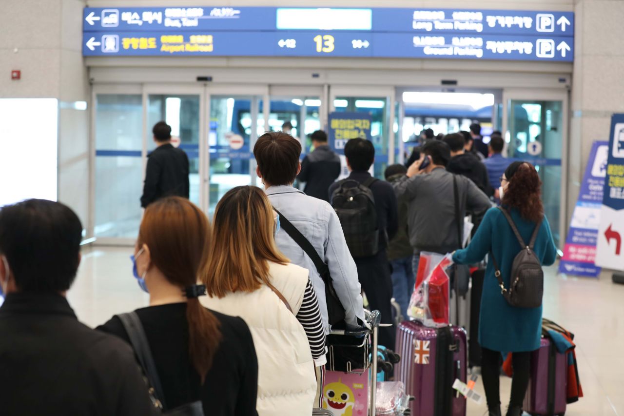해외에서 들어오는 모든 입국자의 2주간 자가격리 의무화가 시작된 1일 인천국제공항 1터미널 입국장에서 입국자들이 KTX 광명역으로 향하는 해외입국자 특별수송 공항버스에 탑승하기 위해 줄을 서고 있다. /문호남 기자 munonam@