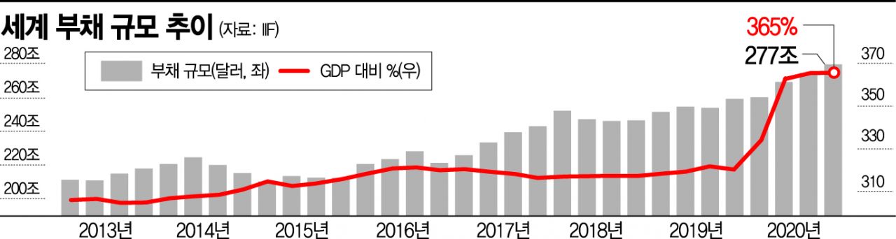 GDP 대비 부채비율도 급격히 올라갔다. 코로나19 1차 확산에 따른 경제 타격이 2분기에 집중되면서 지난해 말 320%이던 이 비율은 올해 2분기 말 362%가 됐고 3분기에는 여기서 2%포인트 추가 상승했다. 연말이 되면 이 비율은 365%까지 오를 것으로 예상된다. 특히 선진국의 GDP 대비 부채비율은 3개 분기 동안 50%포인트 이상 오르면서 432%까지 높아졌다. 상승 폭의 절반은 총부채 80조달러를 기록한 미국에서 발생했다.