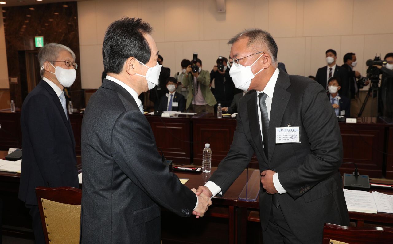 정세균 국무총리와 정의선 현대자동차그룹 회장이 지난 10월15일 서울 종로구 정부서울청사에서 열린 '제2차 수소경제위원회'에 참석해 악수하는 모습./강진형 기자aymsdream@