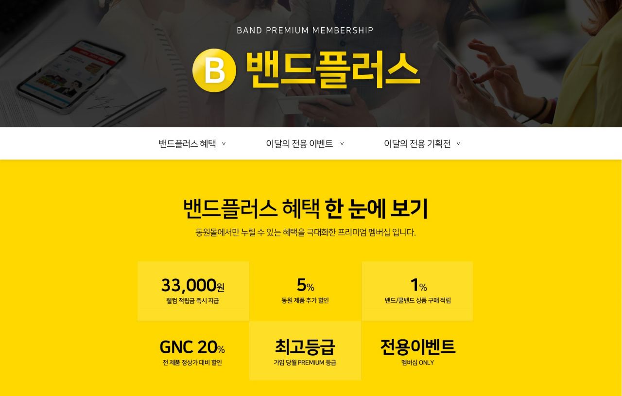 밴드플러스는 연회비 3만원으로 가입 가능하며, 회원에게 연회비 이상의 풍성한 혜택을 제공한다. 연회비 3만원은 가입 즉시 적립금으로 페이백 하며, 동원 제품 구입시 5% 추가 할인, 밴드·쿨밴드 배송 시 1% 적립, 종합 건강기능식품 브랜드 GNC 전 상품 20% 이상 할인 등 다양한 멤버십 서비스를 진행한다.