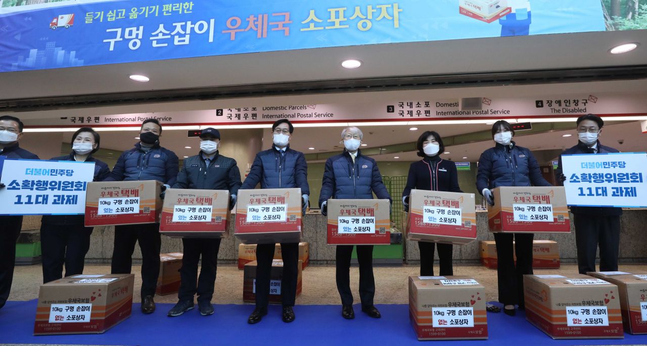 23일 서울 중구 서울중앙우체국 우편창구에서 최기영 과학기술정보통신부 장관과 더불어민주당 신동근 의원 등이 구멍손잡이가 없는 소포상자와 구멍손잡이가 있는 소포상자를 비교해 보고 있다. 구멍 손잡이 소포상자는 비대면 경제활동으로 택배 수요가 급격히 늘어나고 있는 상황에서 집배원, 택배기사, 분류작업자 등 관련 업종 노동자들의 고충을 덜어줄 수 있다는 점에서 의미가 있다./강진형 기자aymsdream@