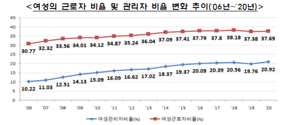 [아시아경제 김보경 기자] 최악의 남녀 임금 격차에도 공공·민간기업 내 여성 관리자 비율은 수년째 20%에 머무르고 있는 것으로 나타났다. 정부가 정한 여성고용 기준에 미달하는 사업장이 전체의 절반(48%)에 달하며, 상습 위반으로 명단이 공표되는 사업장은 외려 매년 늘어나고 있다.