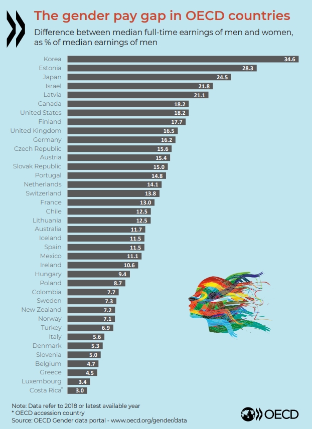 OECD가 발표한 2018년 기준 국가별 남녀임금 격차.