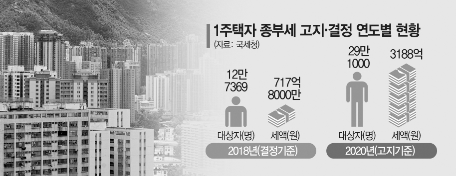 27일 기획재정부와 국세청에 따르면 올해 종부세 대상 1주택자는 29만1000명으로 고지세액은 3188억원이다. 인원과 세액 모두 역대 최대 규모다.