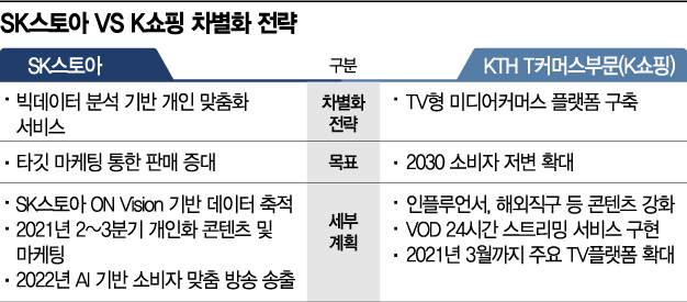 [아시아경제 차민영 기자] 5조원 규모로 급성장한 데이터쇼핑(T커머스) 시장에서도 차세대 IT 기술 활용 방안을 둘러싼 업계 선두주자들의 경쟁이 치열하다. SK스토아는 빅데이터 기반의 개인화 서비스를, KTH(K쇼핑)은 TV형 다중채널네트워크(MCN) 전략을 중장기 전략으로 추진한다.