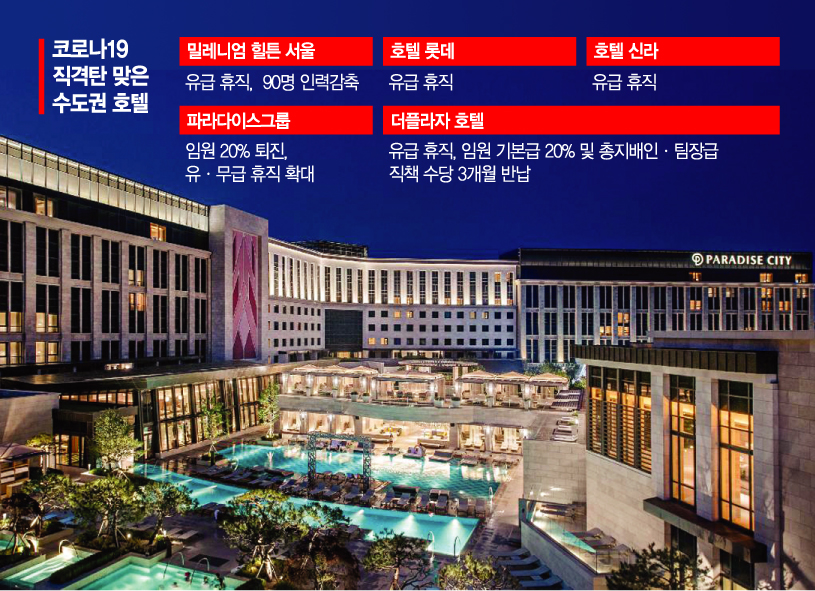 호텔 및 카지노를 운영하는 인천의 파라다이스시티도 대규모 희망퇴직을 실시한다. 외국인 카지노 매출이 대부분을 차지하는 파라다이스시티는 코로나19로 외국 관광객 발길이 뚝 끊기며 장기간 경영 악화에 시달리고 있다. 파라다이스시티는 현재 스파와 클럽, 테마파크를 비롯해 58개 스위트룸으로 구성된 아트파라다이소 건물도 폐쇄한 상황이다.