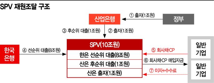 SPV는 다음주중 1차 재원을 조성하고 회사채 · CP 매입을 본격적으로 개시할 예정이다. 우선 출자 1조원, 대출 2조원 등 총 3조원 규모 재원으로 조성되며 나머지 7조원은 캐피탈 콜 방식으로 단계적으로 조성할 계획이다.