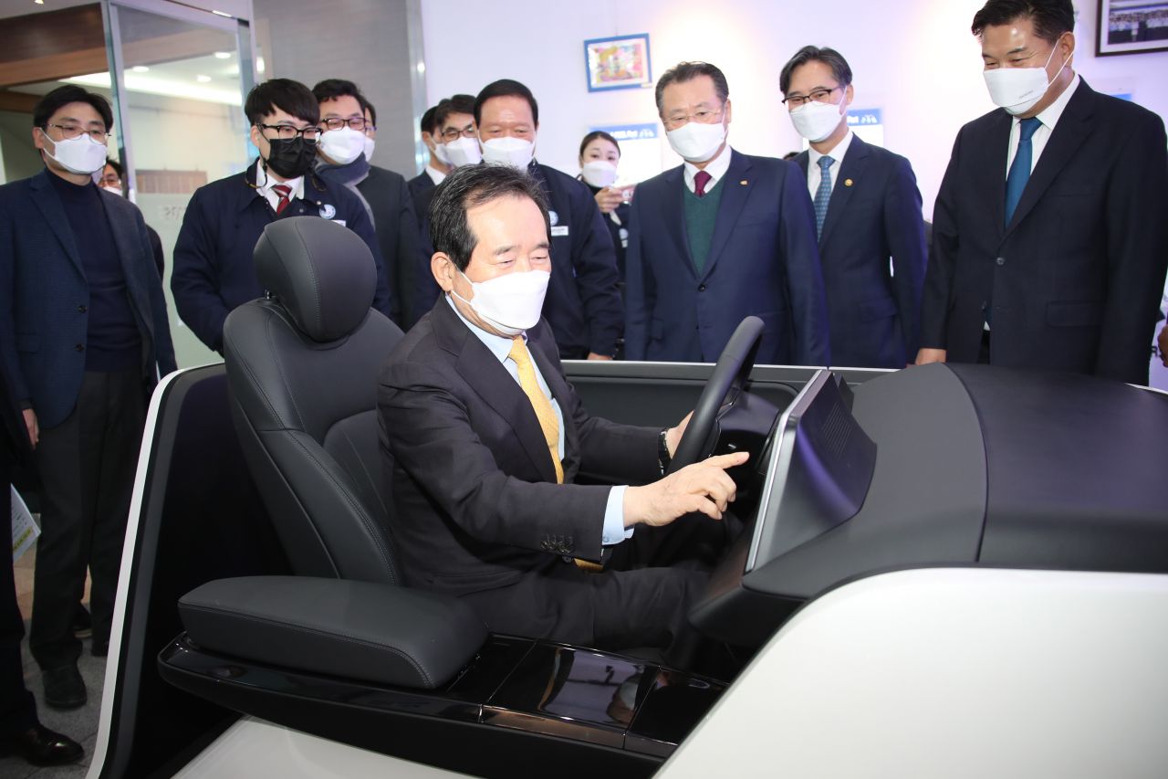세균 국무총리가 28일 대구 달성군 삼보모터스 세천공장을 방문해 터치 센스가 탑재된 자동차 모형에 앉아 있다.(이미지 출처=연합뉴스)