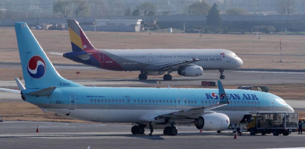 대한항공의 아시아나항공 인수 여부를 결정할 법원 판단이 임박한 가운데 30일 서울 강서구 김포공항 계류장에 대한항공과 아시아나항공 여객기가 활주로를 향해 이동하고 있다. 서울중앙지법은 행동주의 사모펀드 KCGI가 한진칼을 상대로 낸 신주발행 금지 가처분 신청에 대해 이날이나 내일 결론을 내릴 전망이다. 법원이 가처분 신청을 기각하면 인수 작업에 속도가 붙겠지만, 가처분 신청을 인용한다면 인수가 백지화될 가능성이 크다./김현민 기자 kimhyun81@