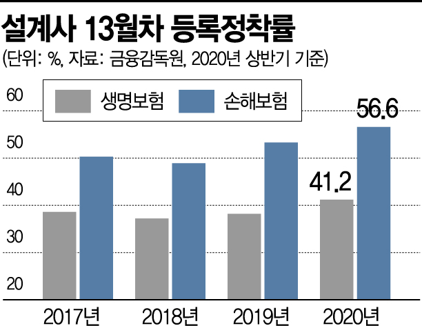 1일 금융감독원에 따르면 생보사 전속 설계사 13월차 등록정착률은 올 상반기 기준 41.2%로 작년말 대비 3%포인트 증가했다. 손해보험사 설계사 등록정착률도 지난해 말 53.3%에서 상반기 56.6%로 3.3%포인트 늘었다.
