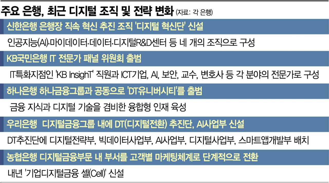 2일 금융권에 따르면 주요 은행들은 올 들어 외부 전문가를 수혈하고 은행장 직속의 혁신 조직을 신설하는 등 디지털 금융 강화에 박차를 가하고 있다.