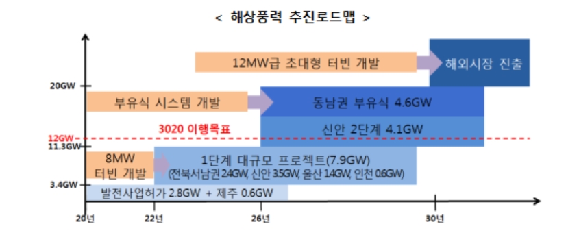 ◆"2030년 해상풍력 12GW 달성"= 현재 상업 운전 중인 국내 해상풍력은 탐라(30MW), 영광(34.5MW), 서남해 실증(60MW) 등으로 다 합해 124.5MW 규모에 불과하다. 정부는 10년 후 해상풍력 설비 규모를 12GW까지 끌어올려 세계 5대 해상풍력 강국으로 도약하겠다는 목표다. 터빈제조, 해상구조물 제작·운반·설치 등 해상풍력 관련 총 63조원에 달하는 대규모 민간투자를 통해 연간 8만7000개의 일자리를 창출할 것으로 전망했다.