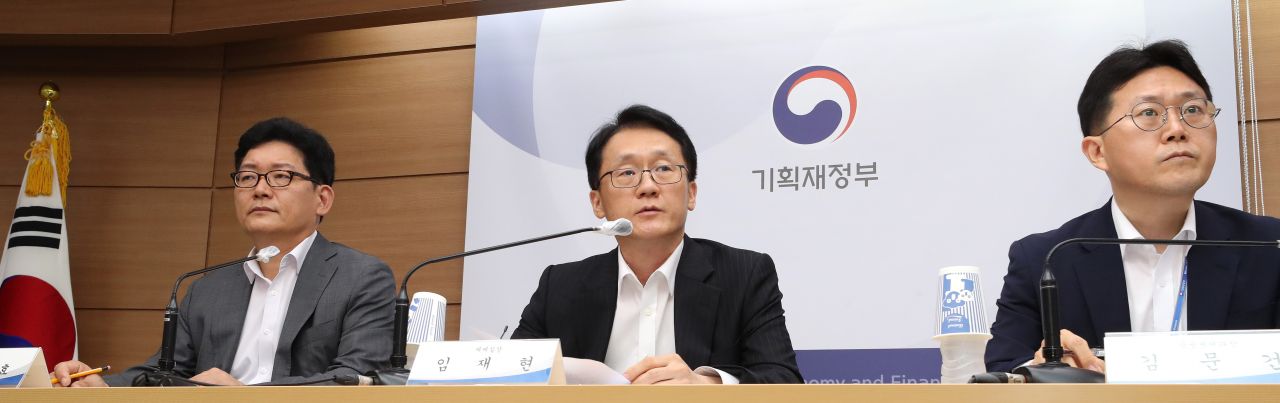 임재현 기획재정부 세제실장(가운데)이 지난달 24일 정부세종청사에서 '금융세제 선진화 추진 방향'과 관련해 브리핑하는 모습.(사진제공=연합뉴스)