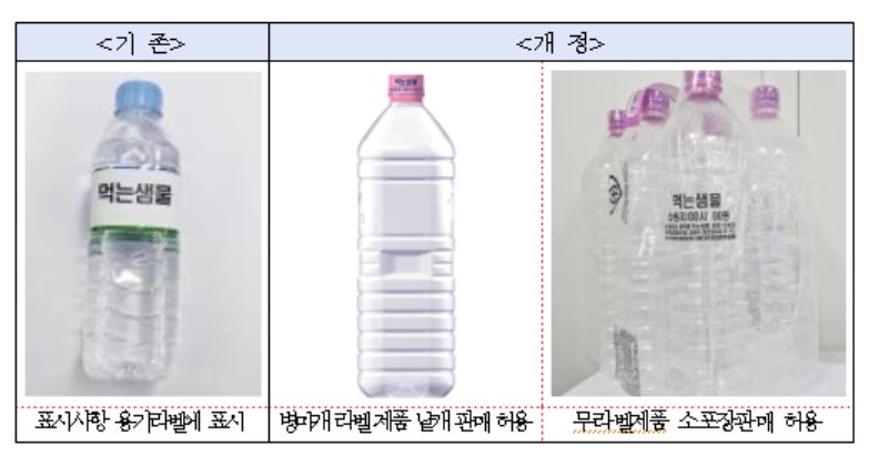 소포장(2ℓ× 6개 들이 등) 제품의 경우 무라벨 제품의 생산을 허용하되 소포장 겉면에 표시사항을 표기하도록 했다. 표시사항이 기재된 포장은 제품을 모두 음용할 때까지는 보관하는 것을 권장한다.