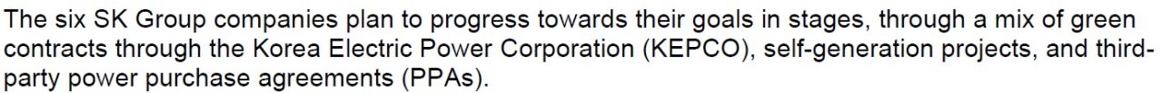 그러면서 "SK 그룹사들은 한국전력을 통한 '녹색 계약'과 자생 사업, 제3자 전력구매계약(PPA) 등을 혼합해 단계적으로 목표를 향해 나아갈 계획"이라고 덧붙였다.