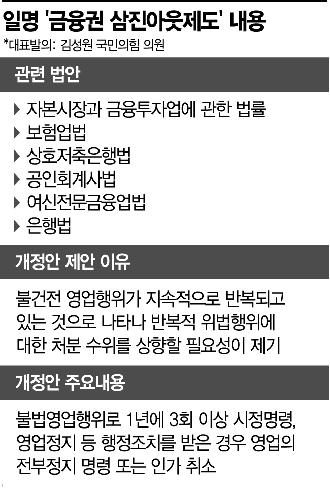 3회 행정처분 시 인가취소…처벌 수위 높인 금융 '삼진아웃제' 개정안 발의4일 금융권 및 정치권에 따르면 국회 환경노동위원회 소속 김성원 국민의힘 의원은 지난 1일 은행법, 보험업법, 여신전문금융업법 등 금융 관련 법안 전반에 걸쳐 처벌 수위를 대폭 높이는 내용의 개정안을 대표 발의했다. 금융회사가 불건전 영업행위로 1년에 3회 이상 시정명령, 영업정지 등의 행정처분 대상이 된 경우 영업의 전부정지 명령 또는 인가 취소의 대상이 되게 하는 것이 개정안의 주요 골자다. 금융권 삼진아웃제를 적용하는 법안은 자본시장법을 비롯해 보험업법, 상호저축은행법, 공인회계사법, 여신전문금융업법, 은행법 등이다.