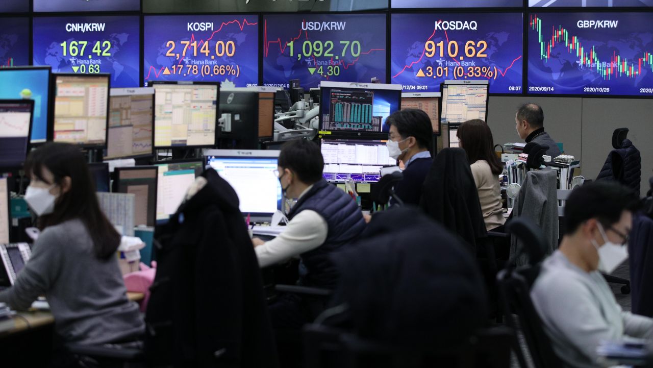 코스피가 사상 처음으로 2,700선을 넘어섰다. 4일 코스피는 전장보다 9.12포인트(0.34%) 오른 2,705.34에 개장해 강세 흐름을 보이고 있다. 이날 원·달러 환율은 전 거래일 대비 4.5원 내린 1092.5원에 출발했다. 사진은 이날 오전 서울 중구 하나은행 딜링룸 모습./김현민 기자 kimhyun81@