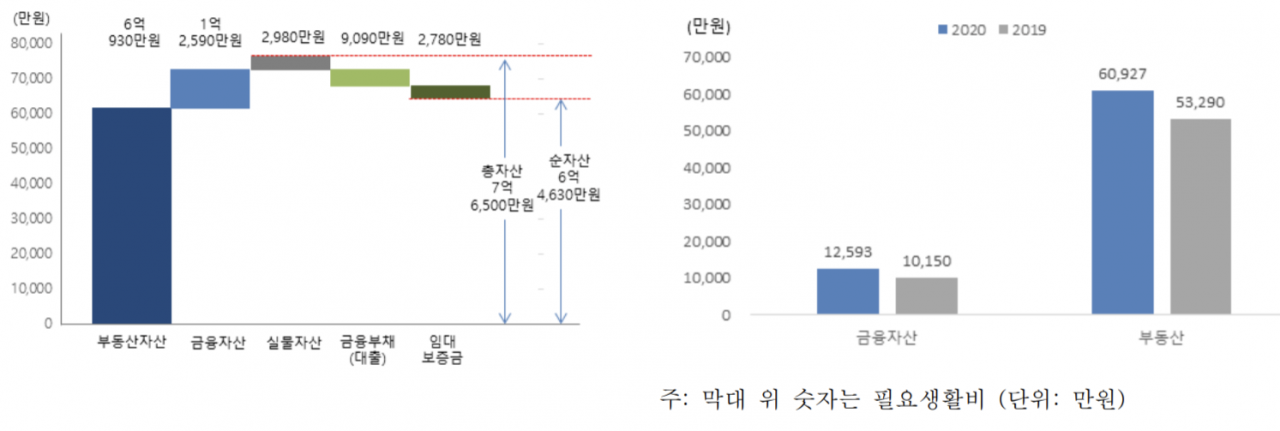 이 중 부동산자산은 6억900만원으로 전년 대비 7600만원(14.3%), 금융자산은 1억2600만원으로 2400만원(24.1%) 늘었다. 총자산 중 금융자산과 부동산자산의 비중은 각각 18.9%ㆍ76.6%로 전년과 마찬가지로 부동산에 편중돼있는 것으로 나타났다.