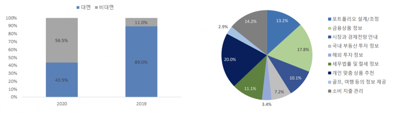 설문 대상자의 44.3%는 코로나19 사태 발생 이후 디지털 금융 이용도가 증가했다고 답했다. 인터넷ㆍ모바일 애플리케이션(앱) 등 비대면 자산관리 채널 이용 경험자 비중은 지난해 11.0%에서 올해 56.5%로 대폭 증가했다.
