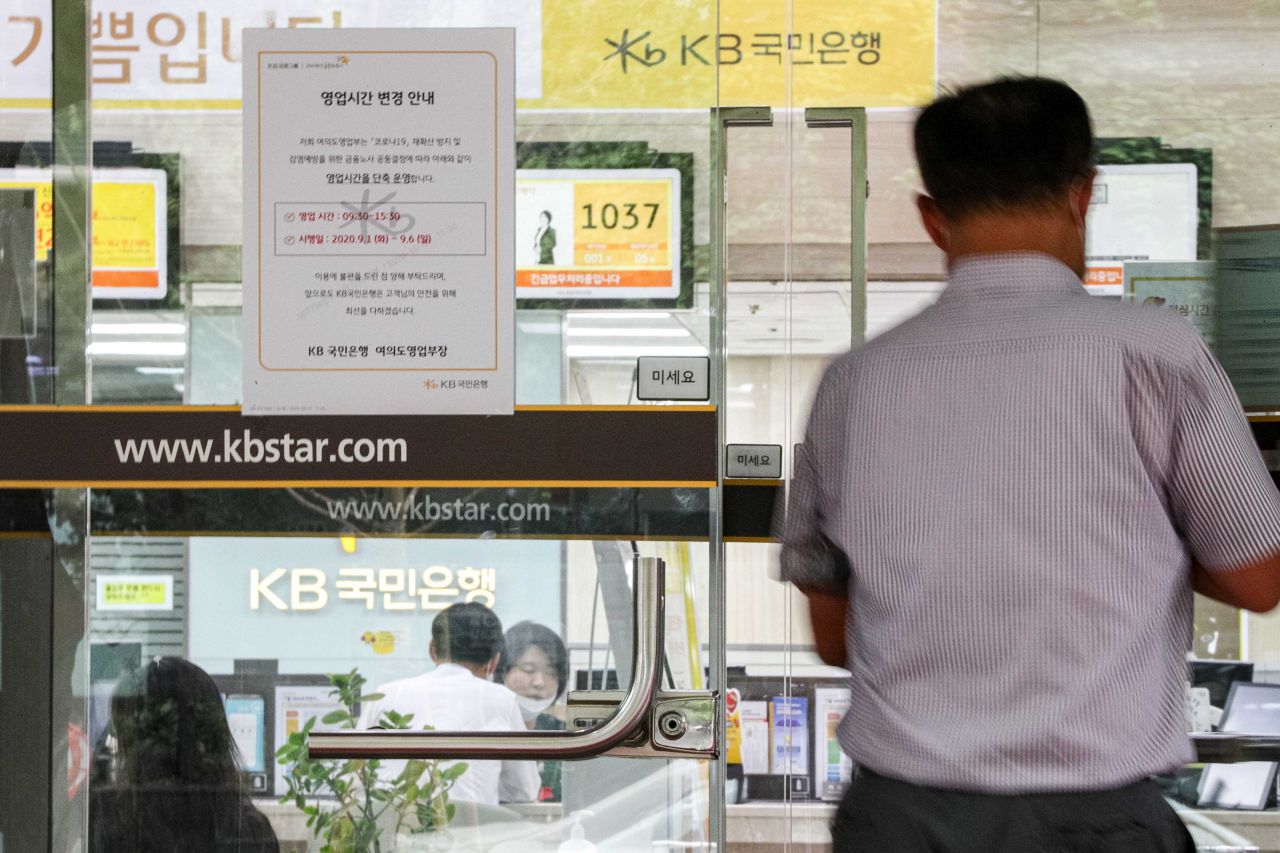 신종 코로나바이러스 감염증 확산을 막기 위해 수도권 지역의 은행 영업시간이 단축된 지난 9월 1일 서울 여의도 국민은행에 단축영업을 알리는 안내문이 붙어 있다. /강진형 기자aymsdream@