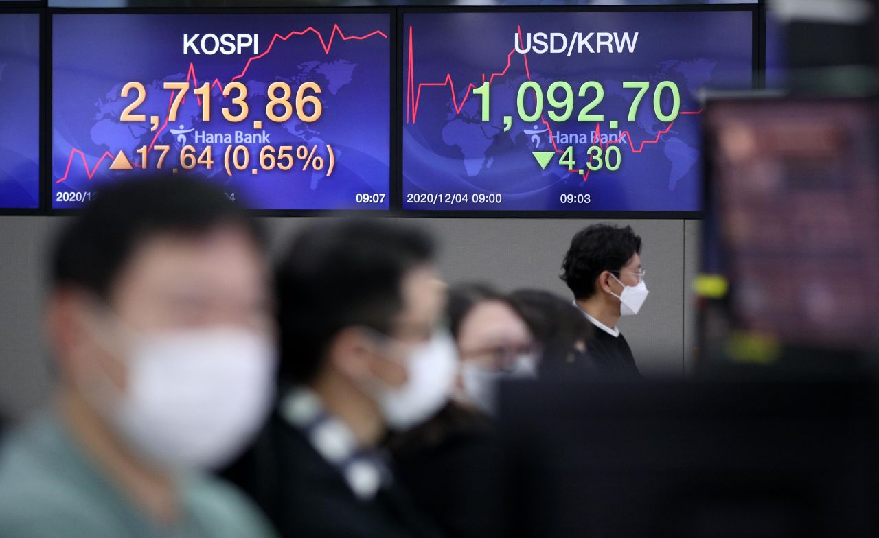 코스피가 사상 처음으로 2,700선을 넘어섰다. 4일 코스피는 전장보다 9.12포인트(0.34%) 오른 2,705.34에 개장해 강세 흐름을 보이고 있다. 이날 원·달러 환율은 전 거래일 대비 4.5원 내린 1092.5원에 출발했다. 사진은 이날 오전 서울 중구 하나은행 딜링룸 모습./김현민 기자 kimhyun81@