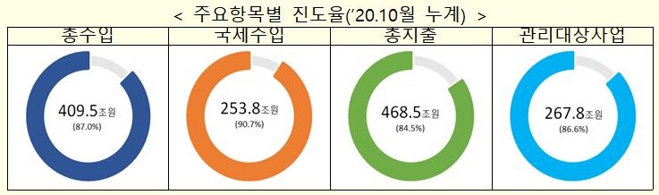 기재부 관계자는 "재정수지·국가채무는 예년 추세대로 진행 중이고, 연말까지 4차 추경 기준(관리재정수지 -118조6000억원, 국가채무 846조9000억원)으로 관리될 예정"이라고 말했다.