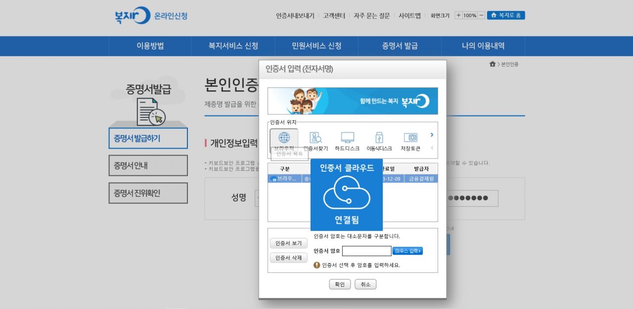 공인인증서 독점 지위가 종료된 첫날인 10일. 금융권과 22개 은행이 공동으로 개발한 금융인증서비스를 발급받아 보건복지부 홈페이지에서 민원신청을 하자 클라우드에 보관된 인증서가 자동으로 연결됐다.