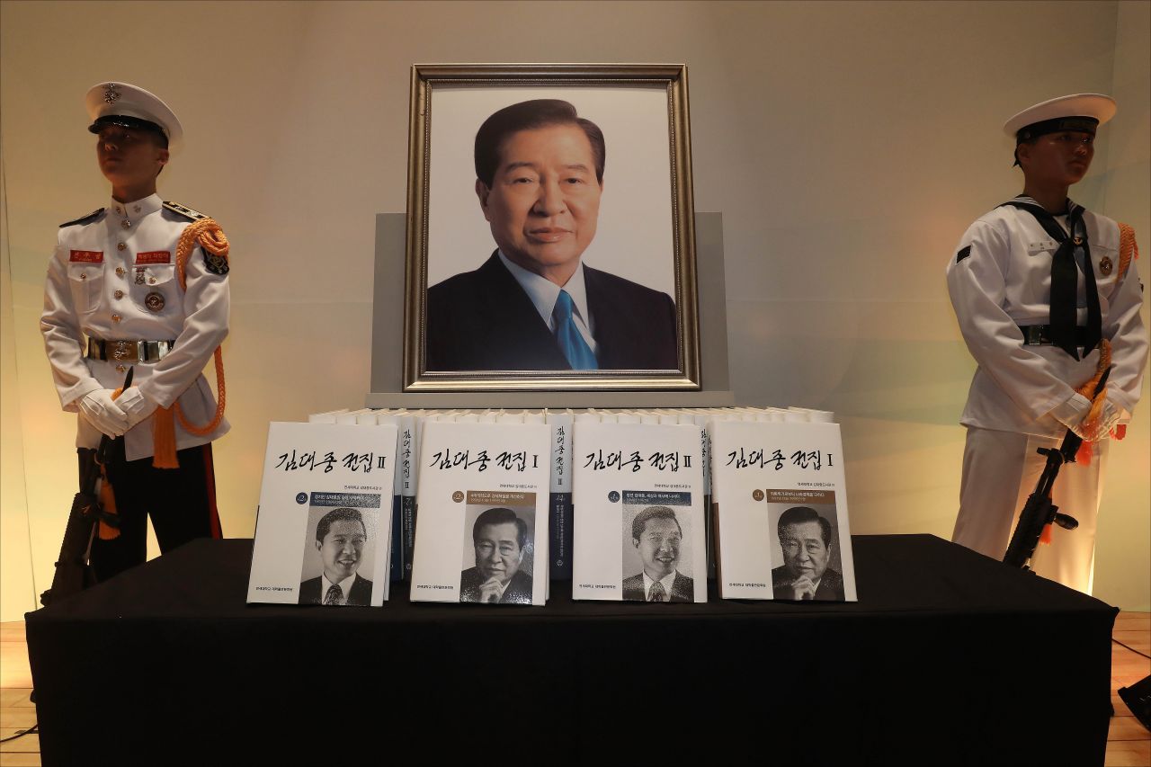18일 오전 서울 동작구 국립서울현충원에서 열린 김대중 대통령 서거 10주기 추도식에서 김대중 전집이 고 김대중 전 대통령의 영전 앞에 헌정되어 있다./김현민 기자 kimhyu81@