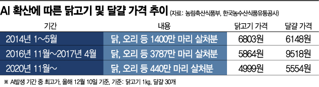2000년 초반 AI가 처음으로 발생했을 당시에는 감염 우려로 닭고기, 달걀 소비가 급감하며 가격이 폭락했다. 하지만 AI가 '매년 찾아오는 손님'으로 인식되며 소비는 그대로 유지되고 살처분으로 인한 공급량만 줄어 가격이 급등하는 것이 일반적이다. 2016~2017년에는 산란계 36%가 처분돼 일부 지역에서 달걀 한 판(30개) 가격이 1만 원을 넘어서는 '달걀 파동'이 시작돼 미국에서 달걀을 공수하기도 했다. 올해는 신종 코로나바이러스감염증(코로나19) 영향으로 내식 수요가 늘어나, AI가 장기화할 때는 더 크게 가격이 오를 거란 우려가 나오고 있다.