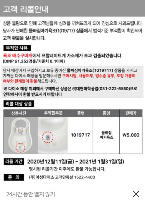 다이소 공시 홈페이지에 게시된 '코스마 아기 욕조' 관련 리콜 공지문