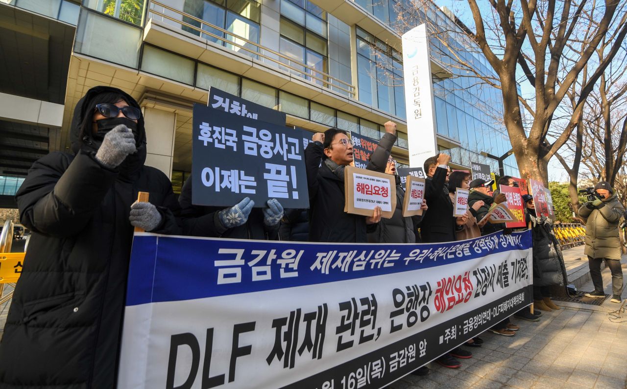대규모 원금 손실을 낸 해외금리 연계형 파생결합펀드(DLF) 사태 관련 금융감독원 제재심의위원회가 열린 16일 서울 여의도 금융감독원 앞에서 DLF피해자대책위원회 관계자 및 금융정의연대 관계자들이 우리은행과 하나은행의 중징계를 요구하는 기자회견을 하고 있다./강진형 기자aymsdream@