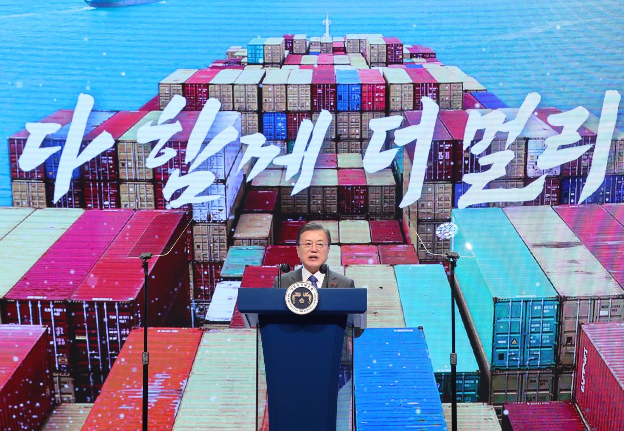 문재인 대통령이 8일 오전 서울 강남구 코엑스에서 열린 '제57회 무역의 날 기념식'에 참석해 축사를 하는 모습.(이미지 출처=연합뉴스)