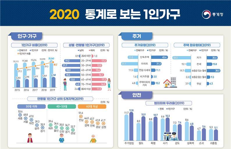 최근 통계청은 이 같은 내용을 담은 '2020 통계로 보는 1인가구'를 발표했다. 이에 따르면 2019년 1인가구는 614만8000가구로 전체 가구의 30.2%를 차지했다. 전체 가구 중 가장 큰 비중이다. 1인가구 비중은 2018년( 29.3%)보다 0.9%포인트 늘었다.