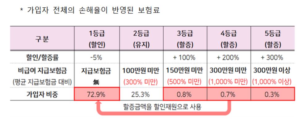 이밖에 보험료 차등제가 실시돼도 현재 운영되는 '2년 연속 무사고자 10% 보험료 할인제도'는 유지된다. 보험료 차등제는 위험보험료를 기반으로 할인·할증되는 반면, 2년 연속 무사고자 10% 할인제도는 부가보험료를 기반으로 운영되기 때문이다. 이에 따라 2년 연속 무사고자는 10% 부가보험료 할인과 더불어 보험료 차등제에 따른 위험보험료 추가 할인을 받을 수 있다.