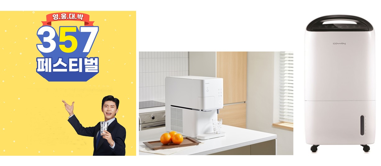 왼쪽부터 청호나이스 '영웅대박 357 페스티벌', 원봉 '루헨스 얼음정수기 아이스케어', 코웨이 '고효율 제습기'.