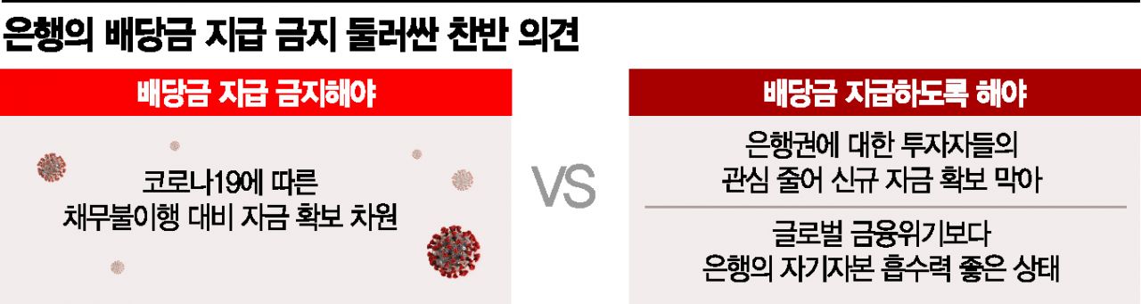 ECB가 은행의 배당을 다시 허용하는 쪽으로 입장을 바꾼 것은 은행권의 요구가 거셌기 때문이다. 은행들은 2008년 글로벌 금융 위기 당시보다 많은 자금을 확보해둬 안전판을 충분히 마련했다는 입장인데, 배당금 지급 금지가 오히려 은행권에 대한 투자자들의 관심을 줄여 새로운 자금이 들어오는 것을 막는다고 주장했다. 유로존 벤치마크인 유로스톡스50지수는 연초 대비 8%가량 하락했으나 유로스톡스은행지수는 같은 기간 25% 이상의 낙폭을 기록했다.