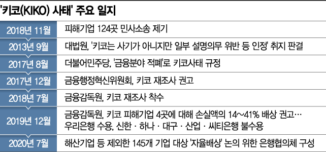반면 앞서 우리은행은 올 초 은행권 중 유일하게 금융감독원의 키코 분쟁조정 결과를 수용하고 피해기업 2곳에 42억원을 배상했다.