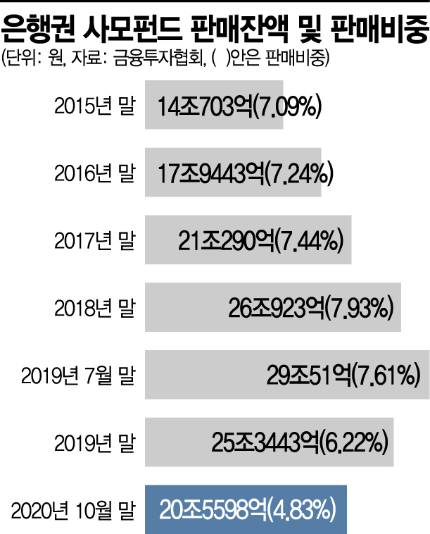 연이은 부실사고에 투자자의 불신이 커지면서 은행권의 사모펀드 판매액은 급감했다. 금융투자협회에 따르면 올해 10월 말 기준 국내 16개 시중은행의 사모펀드 판매잔액은 가장 판매액이 높았던 지난해 7월과 비교해 8조4453억원이 쪼그라든 20조5598억원으로 집계됐다. 8%가 넘었던 기관별 판매 비중도 4%대로 반토막 났다.