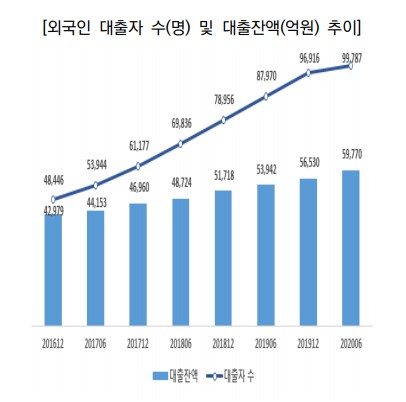 과거에 비해 소액 대출을 중심으로 외국인 대출자 수가 확대된 것이 특징이다. 외국인 1인당 평균 대출잔액은 2016년 8872만원 이후 지속적으로 낮아져 올해 6월말 기준 5990만원으로 내국인(8559만원)에 비해 낮은 수준이다.