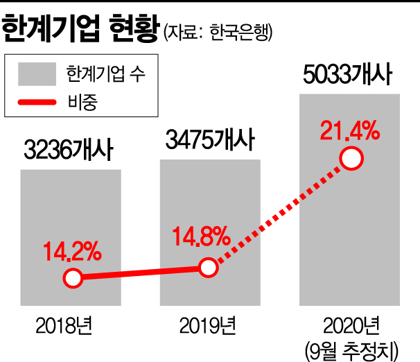 누적된 민간부채가 부메랑으로 돌아올 수 있다는 우려도 있다. 민좌홍 한은 금융안정국장은 "코로나19 위기에서 기업 대출이 무분별하게 늘어나면서 퇴출됐어야 하는 기업들이 남아 있는 결과도 낳았다"고 말했다. 올해 한계기업 비중은 20%를 넘길 것으로 예상된다. 나라별로 고르지 못한(uneven) 회복세가 나타나면 글로벌 경제가 준비되지 않은 상황에서 선진국들부터 돈을 거두면서 신흥국에 충격이 올 수 있다는 점도 리스크다.
