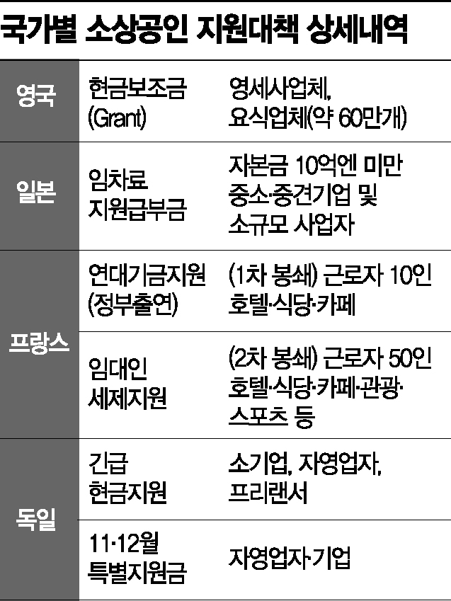 기재부가 보고에서 인용한 사례는 직접 현금지원 방식이다. 제출 자료에 따르면 영국의 경우 지난달부터 봉쇄지역 영세사업체와 요식업체 약 60만곳을 대상으로 월 최대 3000파운드(약 445만원)를 지원하고, 간접 피해 지역의 업체에는 최대 2100파운드를 소급 지급한다. 일본 역시 코로나19 긴급사태를 연장하면서 임대료 부담 경감을 위해 법인엔 최대 600만엔(약 6365만원)을, 개인사업자에는 최대 300만엔을 차등 지급한다. 프랑스는 현금과 세제지원을 병행하는데, 1차 봉쇄 때는 영업중단 또는 매출이 70% 이상 감소한 호텔ㆍ식당에 최대 월 1500유로(약 201만원)를 지급했다. 또 2차 봉쇄땐 50% 이상 감소 업종에 대해 최대 월 1만유로 내에서 매출 피해액을 지원했다. 동시에 임대료 면제 임대인을 대상으로 해당금액의 50% 세액공제를 시행중이다. 독일 역시 1차 전면 봉쇄 당시 3개월간 월 최대 1만5000유로를, 2차 봉쇄 때는 2개월 간 매출 감소액(전년 대비)의 최대 75%를 현금으로 지급했다.