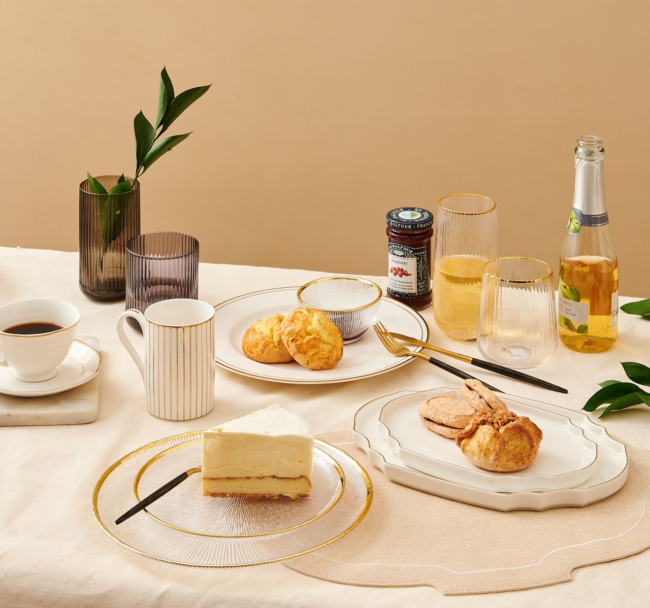 이번에 새롭게 출시한 ‘골드라인 식기’는 집에서 가족들과 연말을 즐기려는 홈파티족을 위한 제품으로, 간편하게 파티 분위기를 연출할 수 있는 대표 아이템이다. 얇고 투광성이 좋은 뉴본 도자기 소재와 조각 패턴의 글라스에 골드 라인을 둘러 고급스러운 분위기 연출이 가능하다.