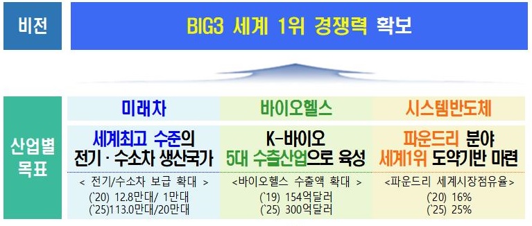 홍 부총리는 "정부는 시스템반도체는 파운드리 분야 세계 1위 도약기반 마련, 미래차는 세계 최고 수준의 전기 수소차 생산 국가, 바이오헬스의 경우 K-바이오 5대 수출산업 육성을 목표로, 궁극적으로는 BIG3 산업 세계 1위 경쟁력 확보를 목표로 집중 육성하겠다"고 말했다.