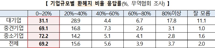 환헤지 비율 '0~20%' 구간 응답률은 대기업 31.3%, 중견기업 69.1%, 중소기업 72.2%였다.