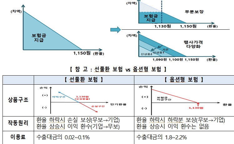 산업부 관계자는 "옵션형 보험은 환율 상승시 환수하지 않는 상품이라 선물환 보험보다는 수수료가 높다"며 "이를 완화하기 위해 부분보장 상품을 추가로 출시해 수수료를 낮출 수 있도록 준비하겠다"고 말했다.