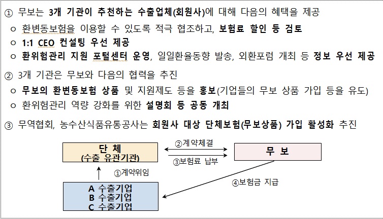 이에 산업부와 무보는 선물환변동 보험료를 최대 45% 할인해주기로 했다. 선물환변동 보험은 무보의 대표 상품으로, 환율 하락시 무보가 기업의 손실을 보상해주고 환율 상승시 이익을 환수받는 상품이다. 이용료는 수출대금의 0.02~0.1%다.