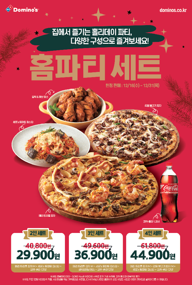 더불어 도미노피자는 연말연시를 맞아 홈파티 세트 메뉴도 함께 선보인다. 메리 트리플 피자(M), 셰프’s 토마토 파스타, 코카-콜라 1.25ℓ로 구성된 ‘홈파티 2인 세트’는 2만9900원, 홈파티 2인 세트에 갈릭&허브윙스가 추가된 ‘홈파티 3인 세트’는 3만6900원, 홈파티 2인 세트에 리얼불고기 피자(M)가 추가된 ‘홈파티 4인 세트’는 4만4900원에 판매한다.