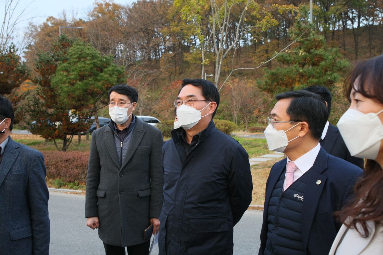 권태성 국민권익위원회 부위원장(왼쪽에서 세 번째)이 지난달 5일 오후 상수원보호구역인 대청호 인근 대전로하스 캠핑장을 방문, 충북도로부터 대청호 상류지역(청남대) 상수원보호구역 일부해제 필요성에 대한 설명을 듣고 있다.(이미지 출처=연합뉴스)